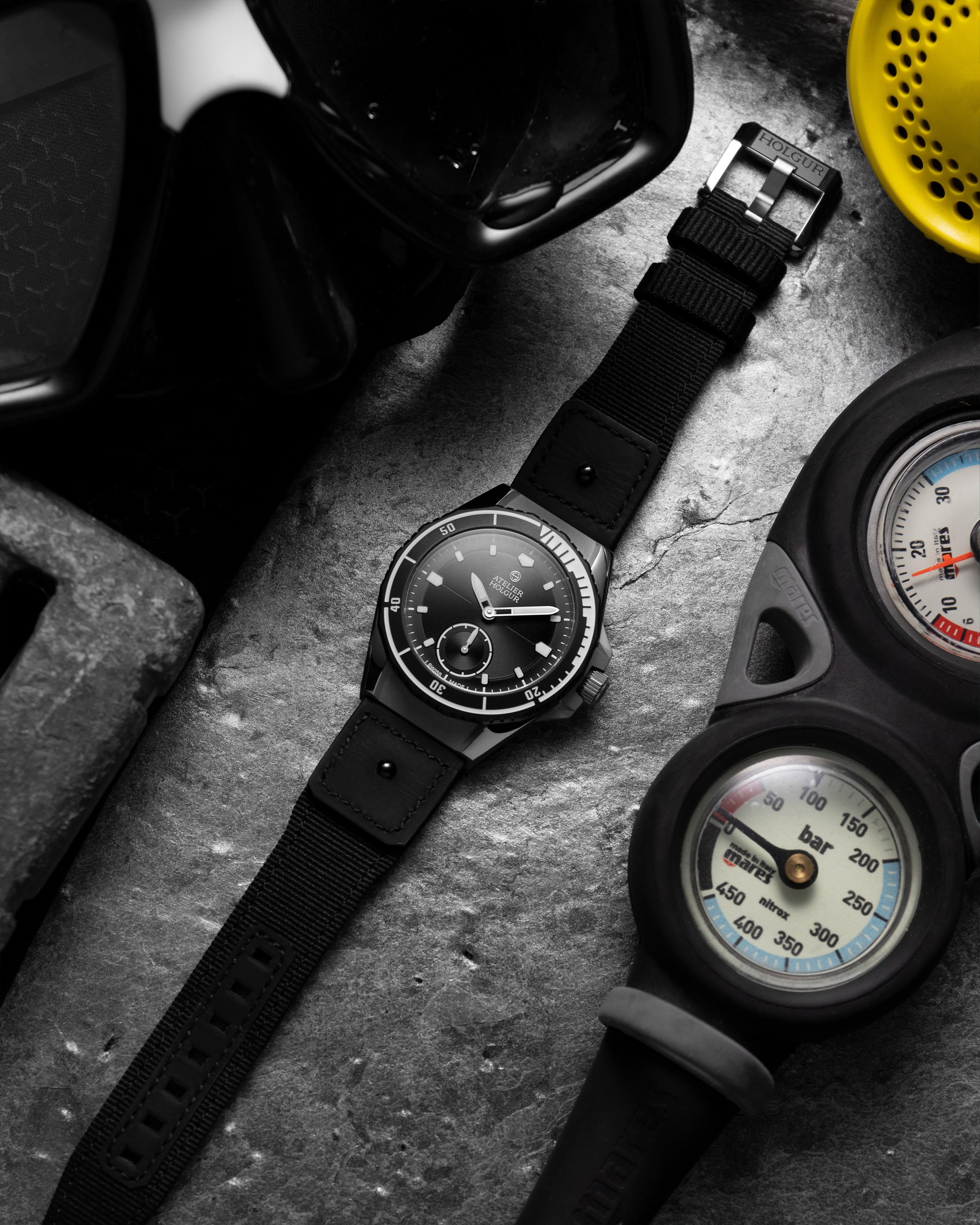 Atelier Holgur is pleased to present the Frømand, a divers’ watch that is equally at home complementing a lounge suit or jeans as it is underwater. It proffers versatility, functionality and a notable degree of style. The name, Danish for ‘frogman’, celebrates the military divers of yesteryear, however, the design language is contemporary, ideally suited to the here and now.